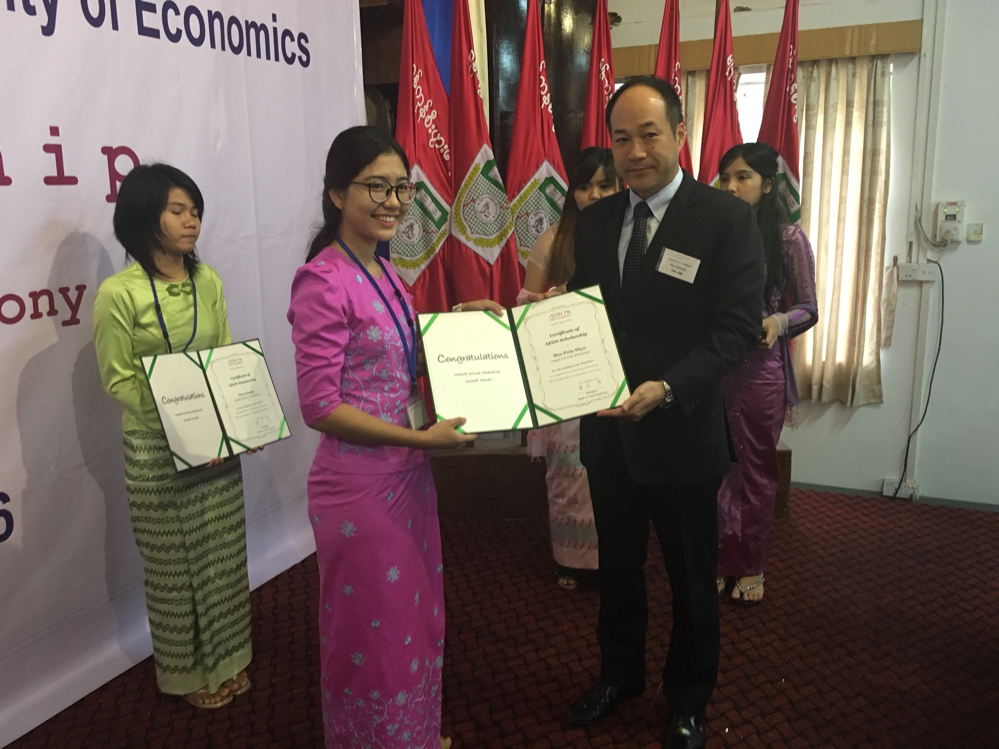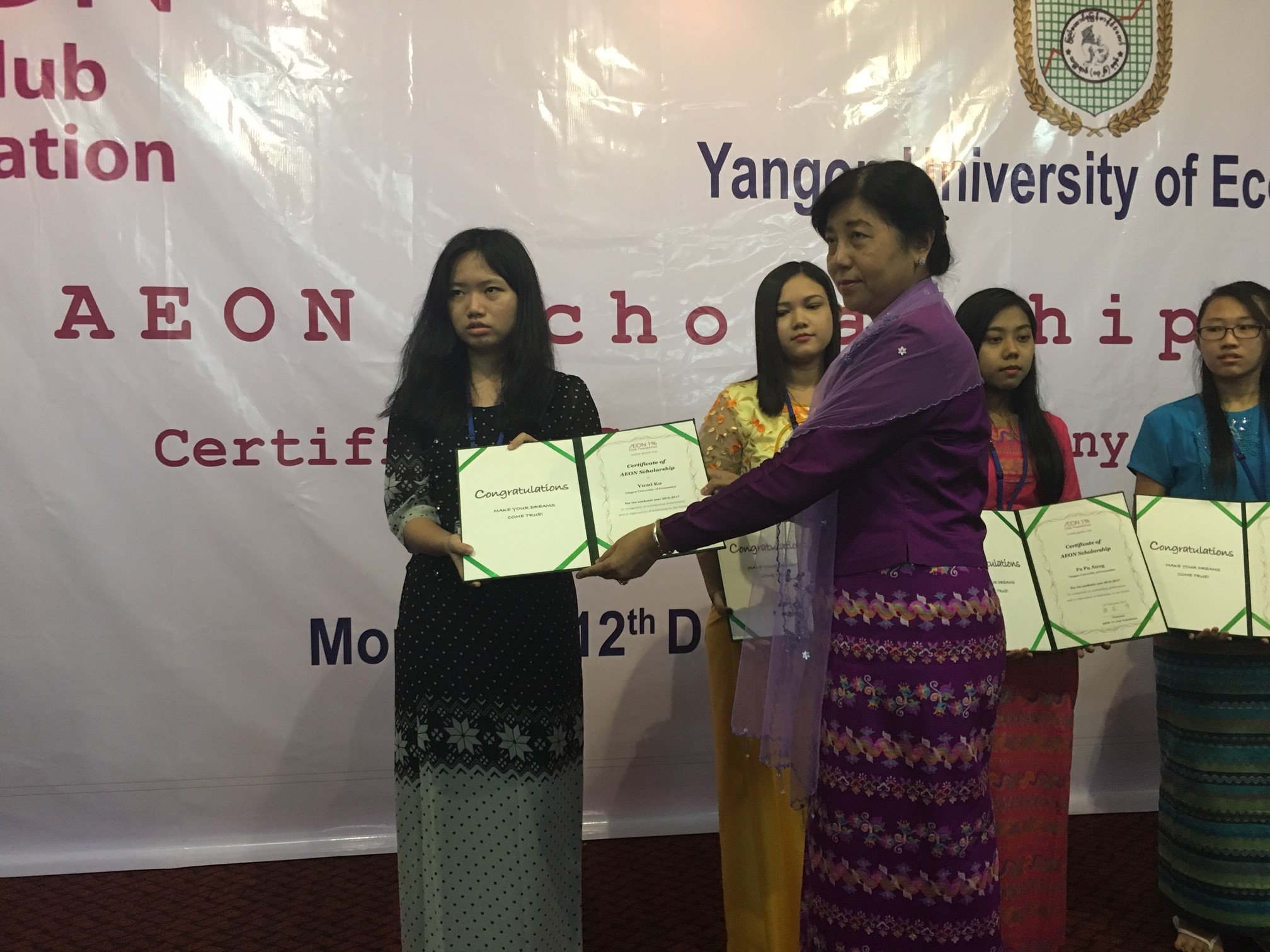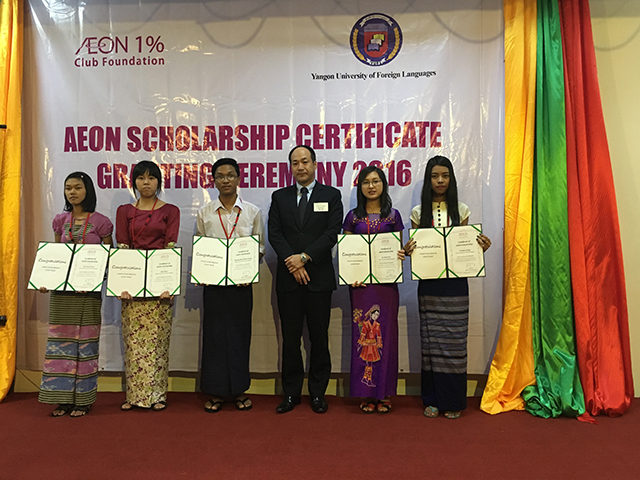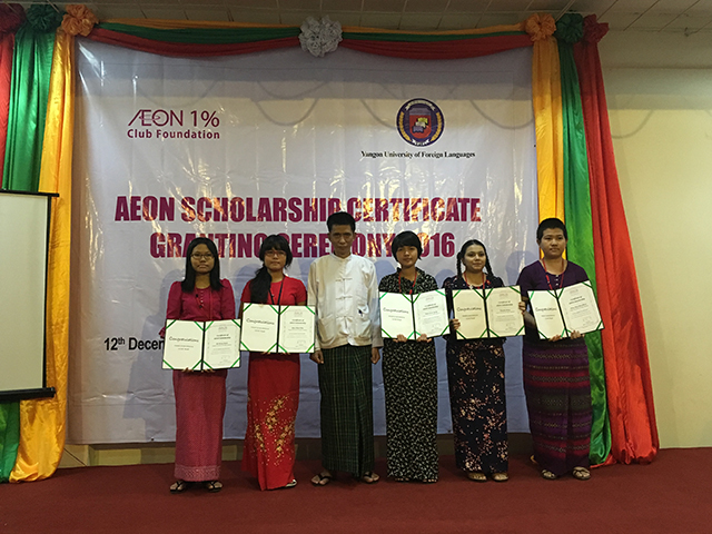 The AEON 1% Club Foundation held AEON Scholarship Certificate Granting Ceremony on Monday, Dec 12th 2016 for 118 Myanmar students from Yangon University of Economics and Yangon University of Foreign Languages.